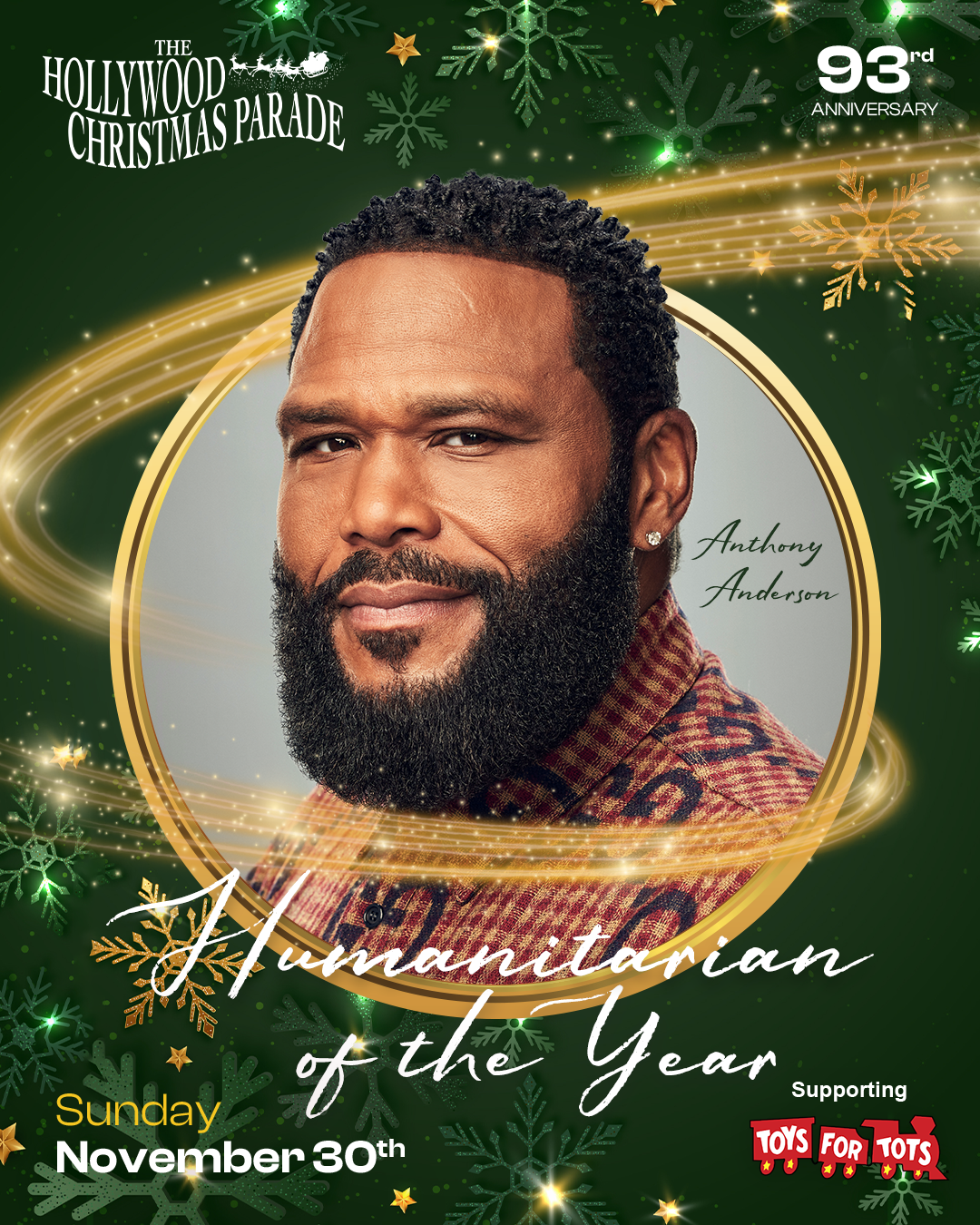 “I am so thrilled to be honored with the humanitarian award for this year’s Hollywood Christmas Parade. This is a tremendous honor and I am so thankful to be acknowledged for my charity work by such a respected establishment in the Hollywood community.” – Anthony Anderson